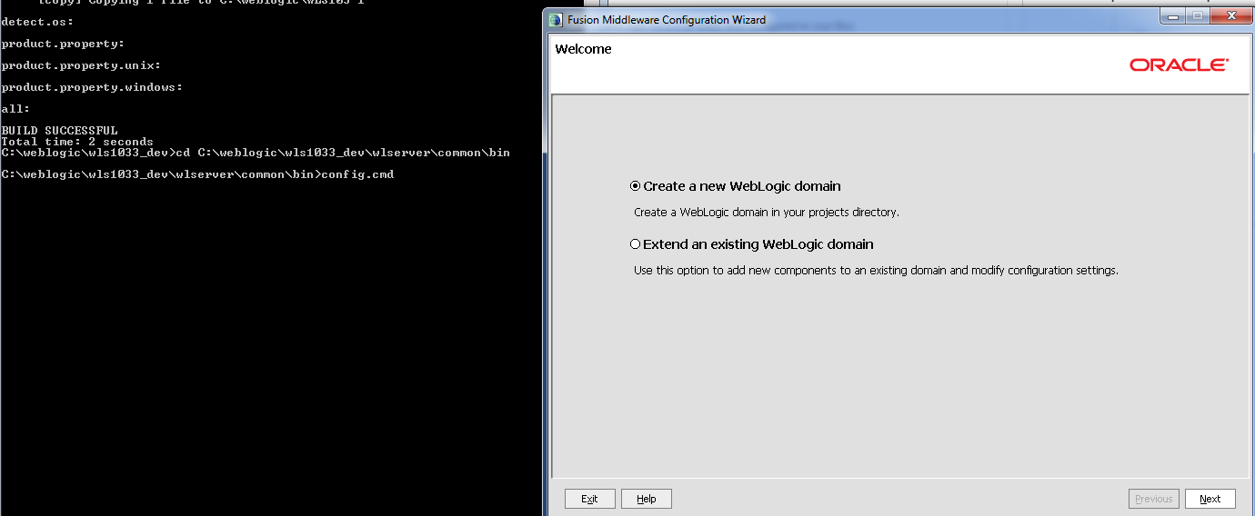 Now cd to location of the common binaries at C:\weblogic\wls1033_dev\wlserver\common\bin, run config.cmd.